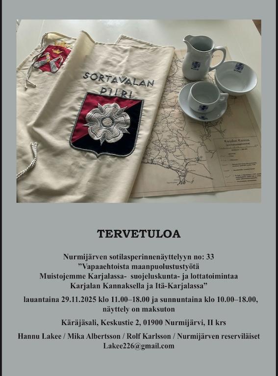 TERVETULOA Nurmijärven sotilasperinnenäyttelyyn no: 33 ”Vapaaehtoista maanpuolustustyötä Muistojemme Karjalassa- suojeluskunta- ja lottatoimintaa Karjalan Kannaksella ja Itä-Karjalassa” lauantaina…