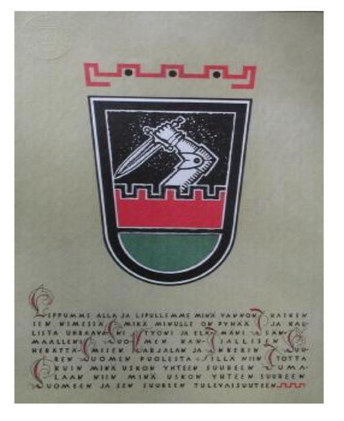 Pohjana 1920-luvun juliste "AKS:n tie" graafikon modifioimana. Kortin takapuolella selittävä teksti: "AKS:n voimakas käsi elää sadan vuoden virstat ohittaen. Idän pilvet ovat aina näkyvissä, varautukaamme viisaasti tulevaan, Suomen historiaa muistaen ja kunnioittaen."