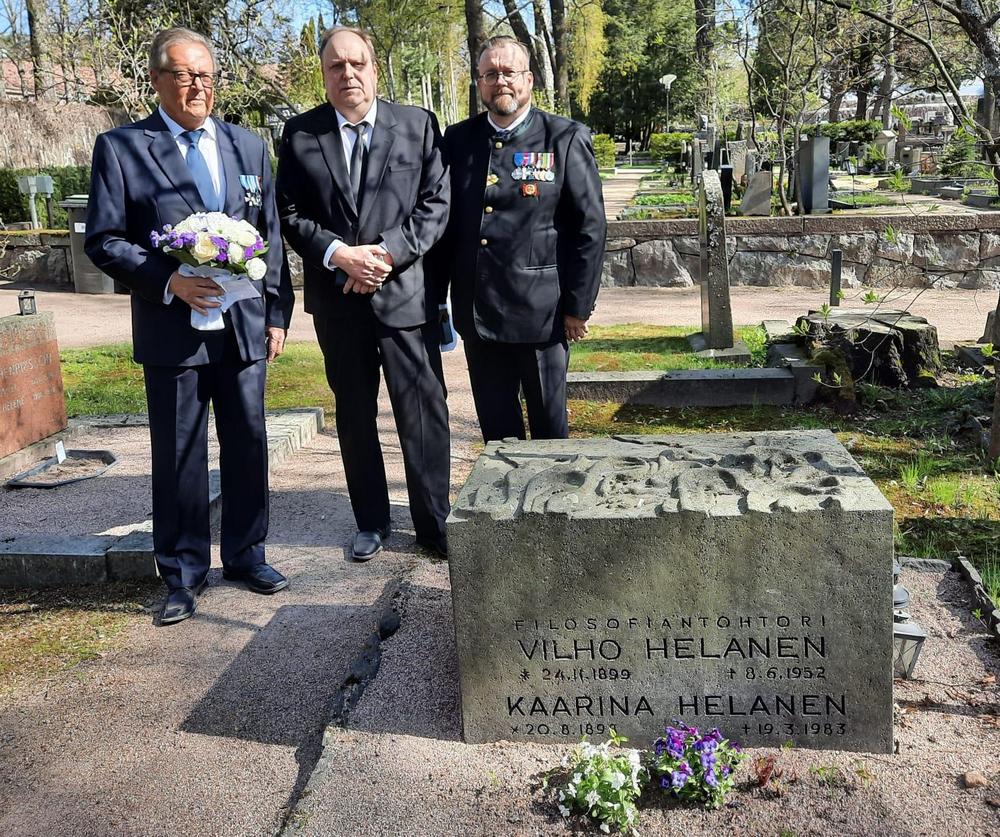 J. V. Snellmanin ja suomalaisuuden päivänä 12.5.2023 juhlittiin AKS:n lipun vihkimisen satavuotispäivää. Ennen Suomen Pankin edessä yhdessä Snellmanien Sukuyhdistyksen kanssa järjestettyä tilaisuutta AKS:n Perinneyhdistyksen hallituksen edustajat kunnioittivat Hietaniemen hautausmaalla seuran merkkihenkilöiden Bobi Sivenin, Reino Vähäkallion, Elmo Kailan, Vilho Helasen, Gunnar Laation ja Matti Lukkarin elämäntyötä kukkatervehdyksin. Kukkapartiossa Erkki Harala, Mika Hakanpää ja Pekka Lehtiö sekä kuvan ottanut Olavi Vähäkallio.