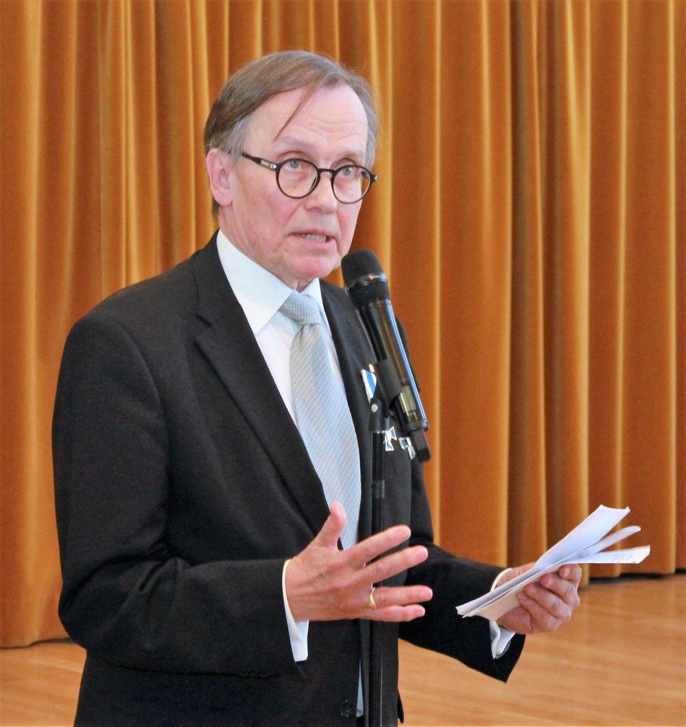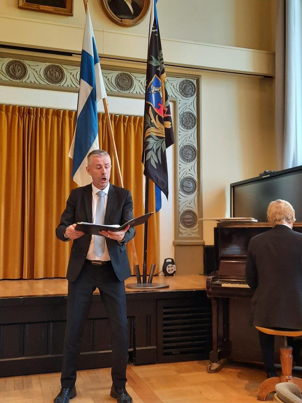 Katse tässä salissa olevien molempien lippujemme puoleen saa aikaan historiallisen perspektiivin tässä ajassa: menneisyys ja tulevaisuus kulkevat rinta rinnan. Sekä yksilöinä että kansana saamme antaa tänäänkin menneisyyden opettavan ohjaavasti puhua. Ja vaikka nykyhetkellä on paikkansa elämämme keskiössä samalla on jo kyse tulevaisuudesta.