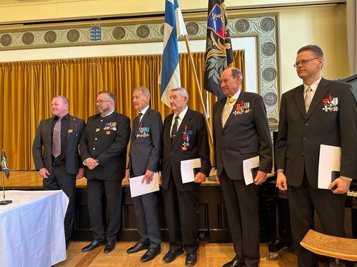 Akateemisen Karjala-Seuran Perinneyhdistyksen hallituksen myöntämät AKS:n ansioristit puheenjohtaja Lehtiö sekä ansioristin asiamies, majuri Kirvesmies luovuttivat FT Vesa Määtälle, VTM Markku Palokankaalle, vuorineuvos Jukka Viinaselle, FM Markku Murrokselle ja lääket. lis. Olavi Larmalle, joka kiitti huomionosoitusten saajien puolesta juhlivaa yhdistystä.