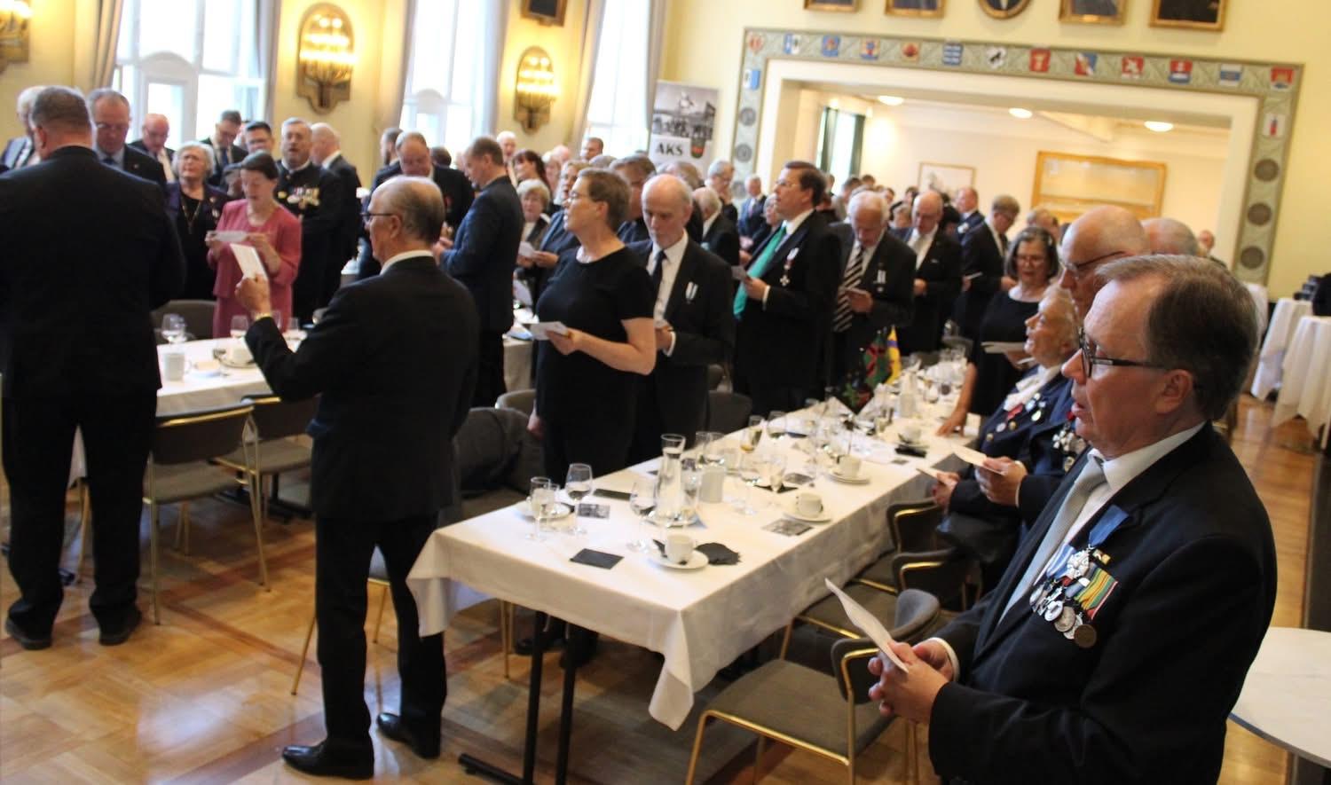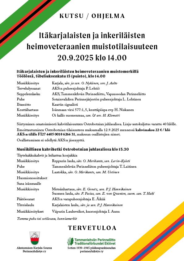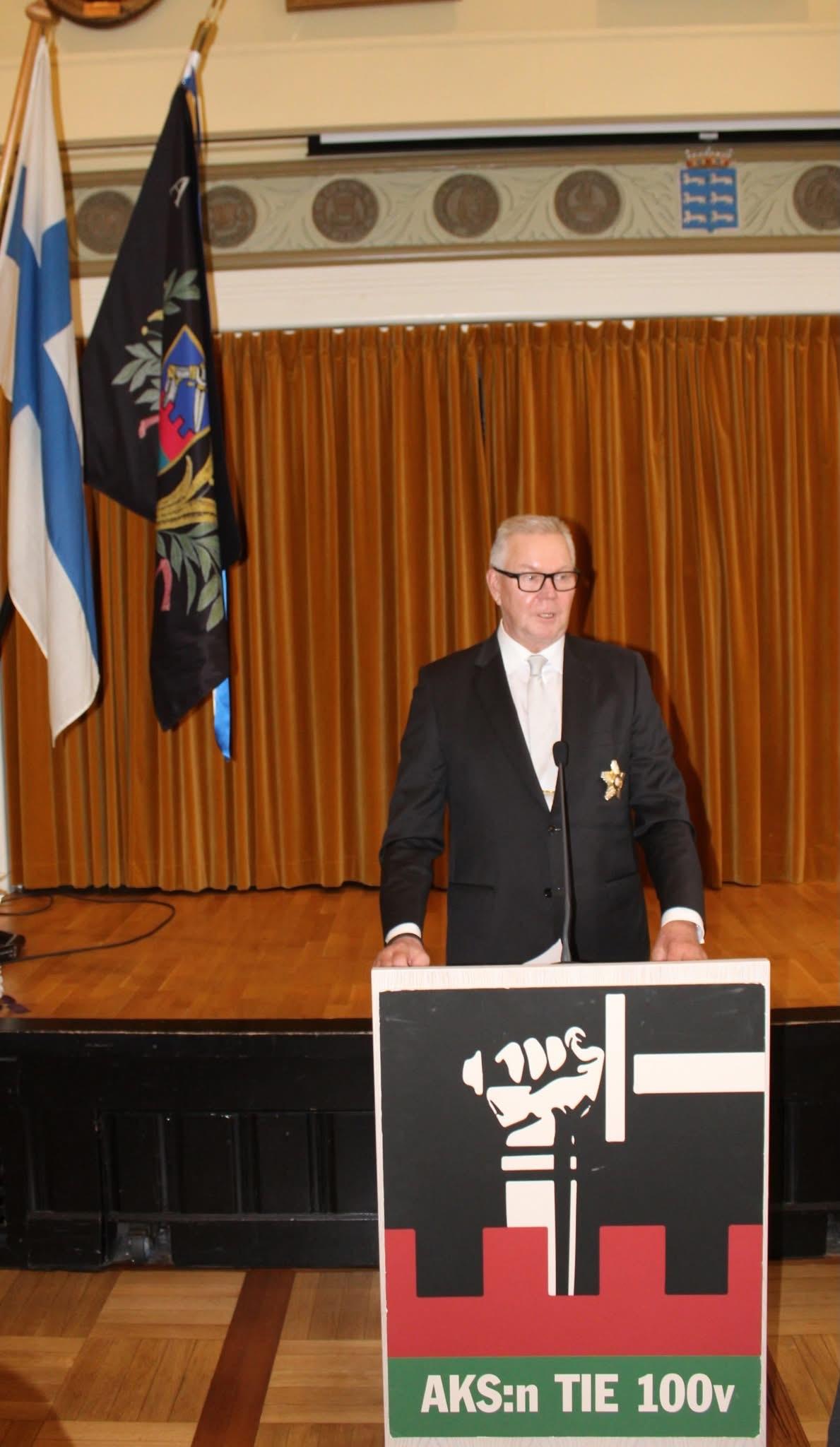 Toisen kerran järjestetty Heimoveteraanien muistojuhla kokosi Ostrobotnian juhlasalin ääriään myöten täyteen ja paikalle saapuneet, kaikkiaan lähes 120 henkilöä edustivat laajalti veteraaniperinteen toimijoiden kirjavaa kenttää. Ensin muistomerkillä ja sen jälkeen juhlassa olivat uljaasti esillä Suomen siniristilipun rinnalla sekä Tammenlehvän Perinneliiton, että Akateemisen Karjala-Seuran Perinneyhdistyksen lippu.