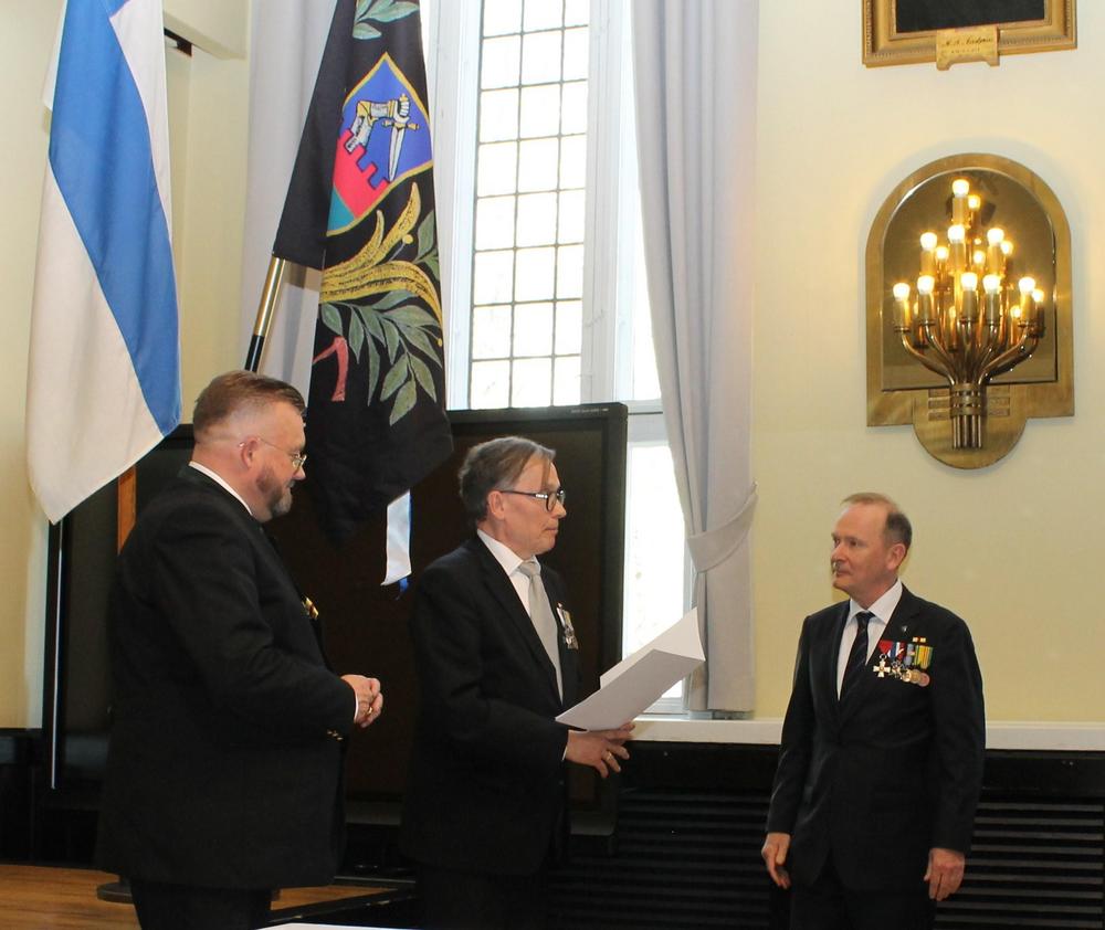 Vapaussodan Perinneliiton Sinisen ristin luovuttivat liiton puheenjohtaja Jouni Koskela ja toiminnanjohtaja Sami Rantanen Jussi Airakselle, Jyrki Pekkoselle ja Seela Sellalle.