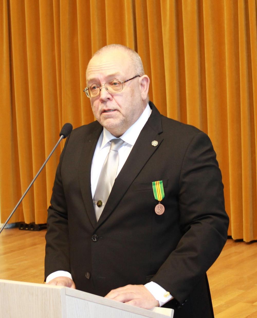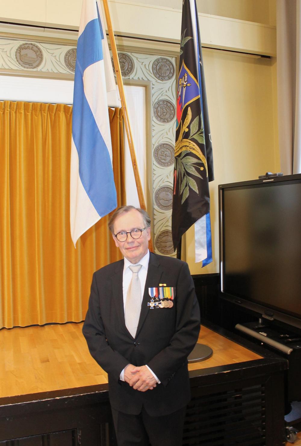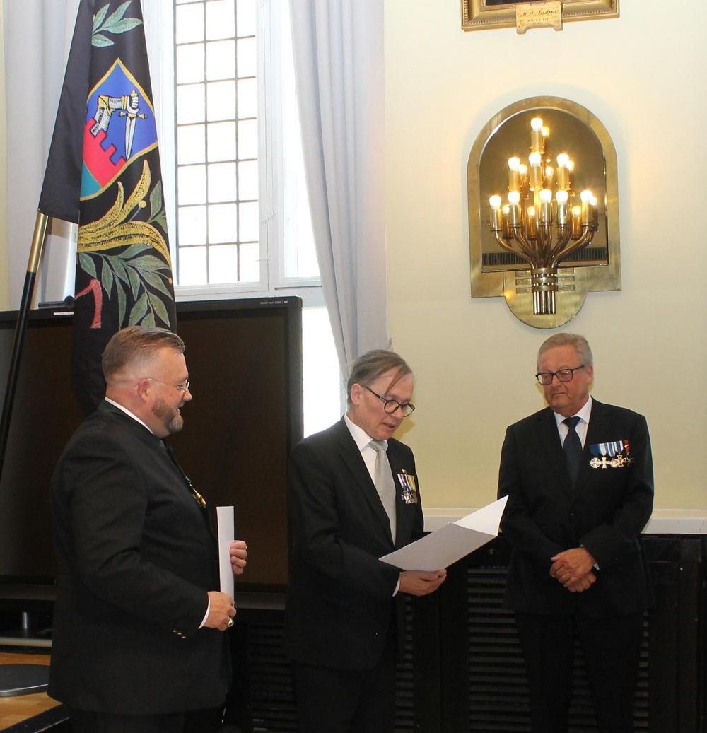 Jalkaväen tarkastajan myöntämä Jalkaväen ansioristi luovutettiin Pekka Lehtiölle ja Tasavallan Presidentin antamat Suomen Valkoisen Ruusun ritarikunnan ritarimerkki Pasi Koskenrannalle, Suomen Valkoisen Ruusun ritarikunnan ansioristi Erkki Haralalle ja Suomen Leijonan ritarikunnan ansioristi Olavi Vähäkalliolle (eivät kuvassa). Kuvat: Vesa Määttä