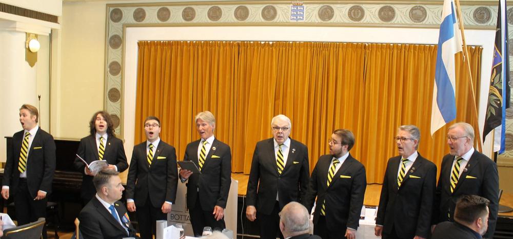 Snellmanin päivän tilaisuudessa huomioitiin isänmaallisesta harrastuneisuudesta ja perinnetyöstä AKS:n pöytälipulla Hannu Lakee, Sami Rantanen ja Ari Åberg (ei kuvassa).